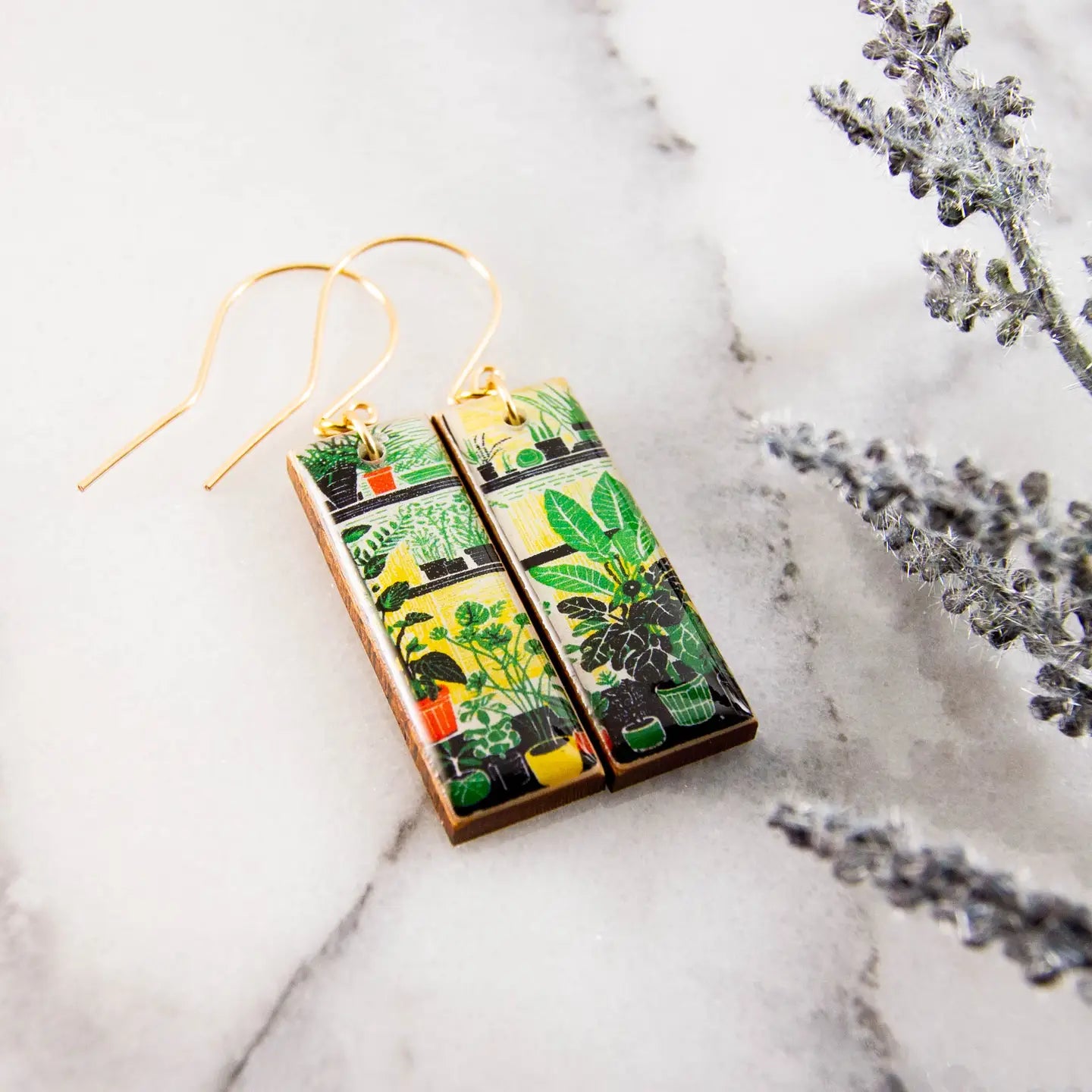 Perfect for the green thumbs in your life! These delightful earrings feature a retro style plant shop window illustration, rendered in green, yellow, and orange. Made from sustainably sourced North American hardwood and finished with soy-based, BPA/VOC free resin, these vibrant earrings will bring joy and brightness to any wardrobe. Handcrafted gold fill ear wires. Approximately 2.25 inches long.