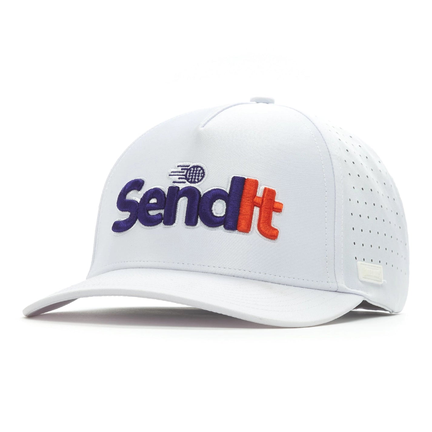 * Poly/Spandex blend performance material * Sweat stain resistant * Custom interior lining * Perforated Back * Snapback