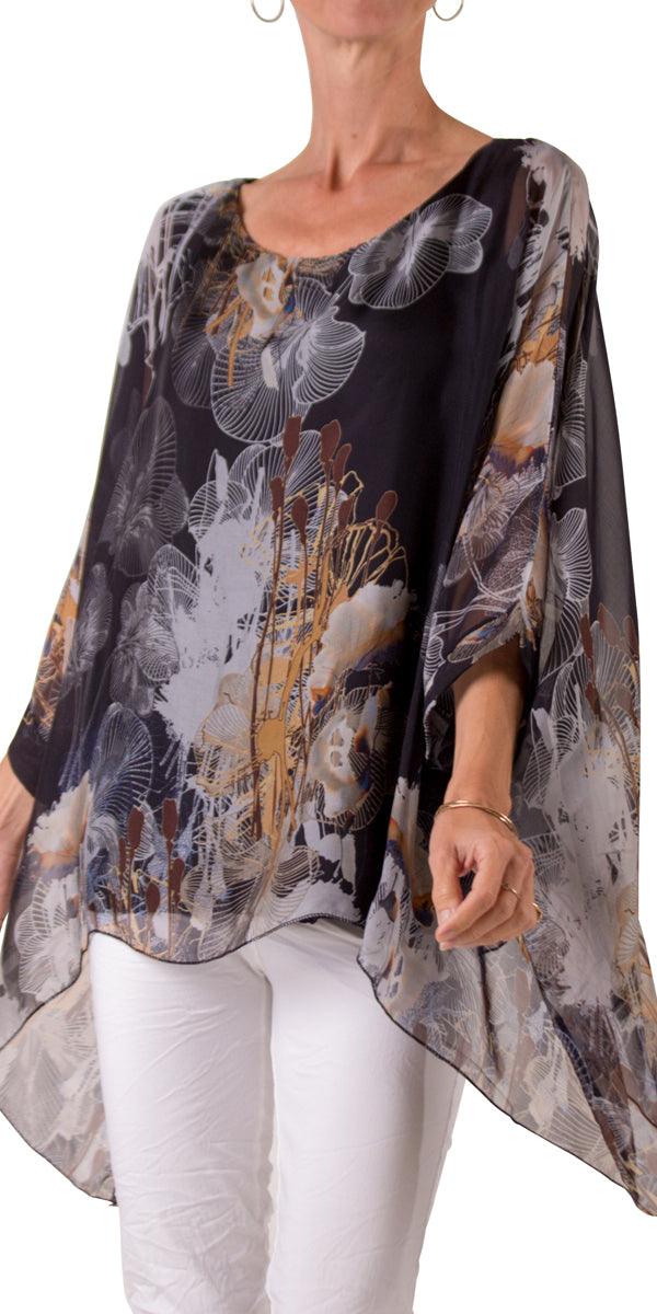Silk Kaftan Style Floral Blouse. Features 3/4 Length Sleeves and a Wavy Bottom.